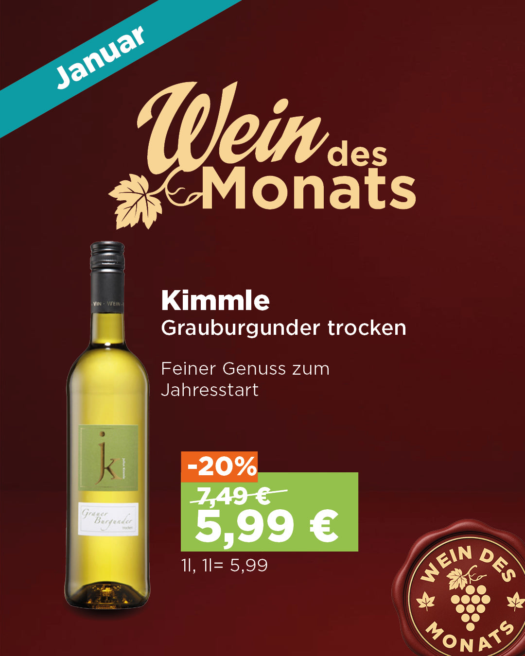 Preis: 7,49 €Angebotspreis: 5,99 €Grundpreis: € 5,99pro lQualitätsstufe: Deutscher Qualitätswein Herkunft: Anbaugebiet Pfalz Traubensorte Grauer Burgunder Geschmacksrichtung: trocken - Gehaltvoll, saftig,...